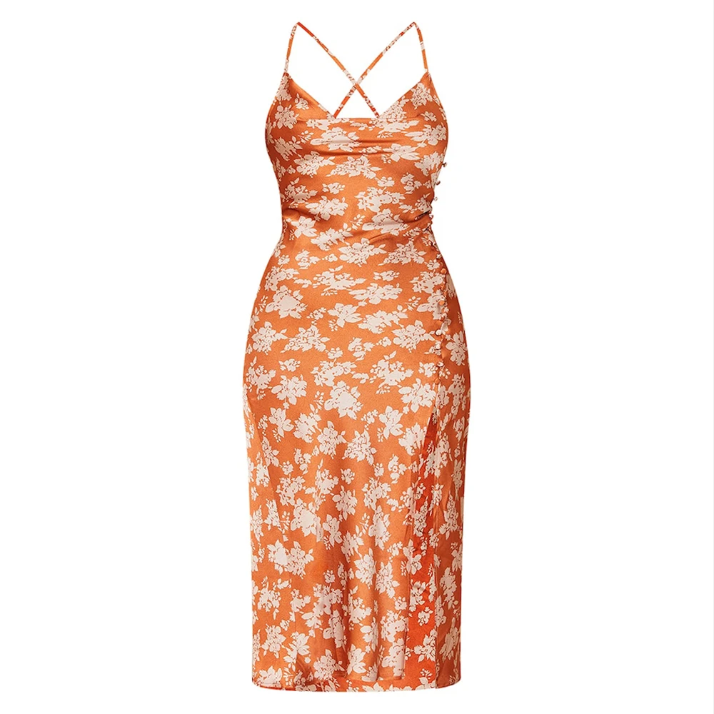 Factory Custom High Quality Floral Printed Midi Dress Summer Backless Women Sexy Cowl Neck Satin slip Dress